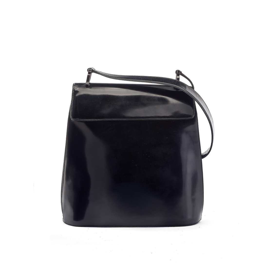 black patent leather, black and grey logoed fabric interior. Patent leather handle. Flap closure with magnetic fastening; the flap conceals a front zip pocket with logoed pull. Silver-tone metal hardware.