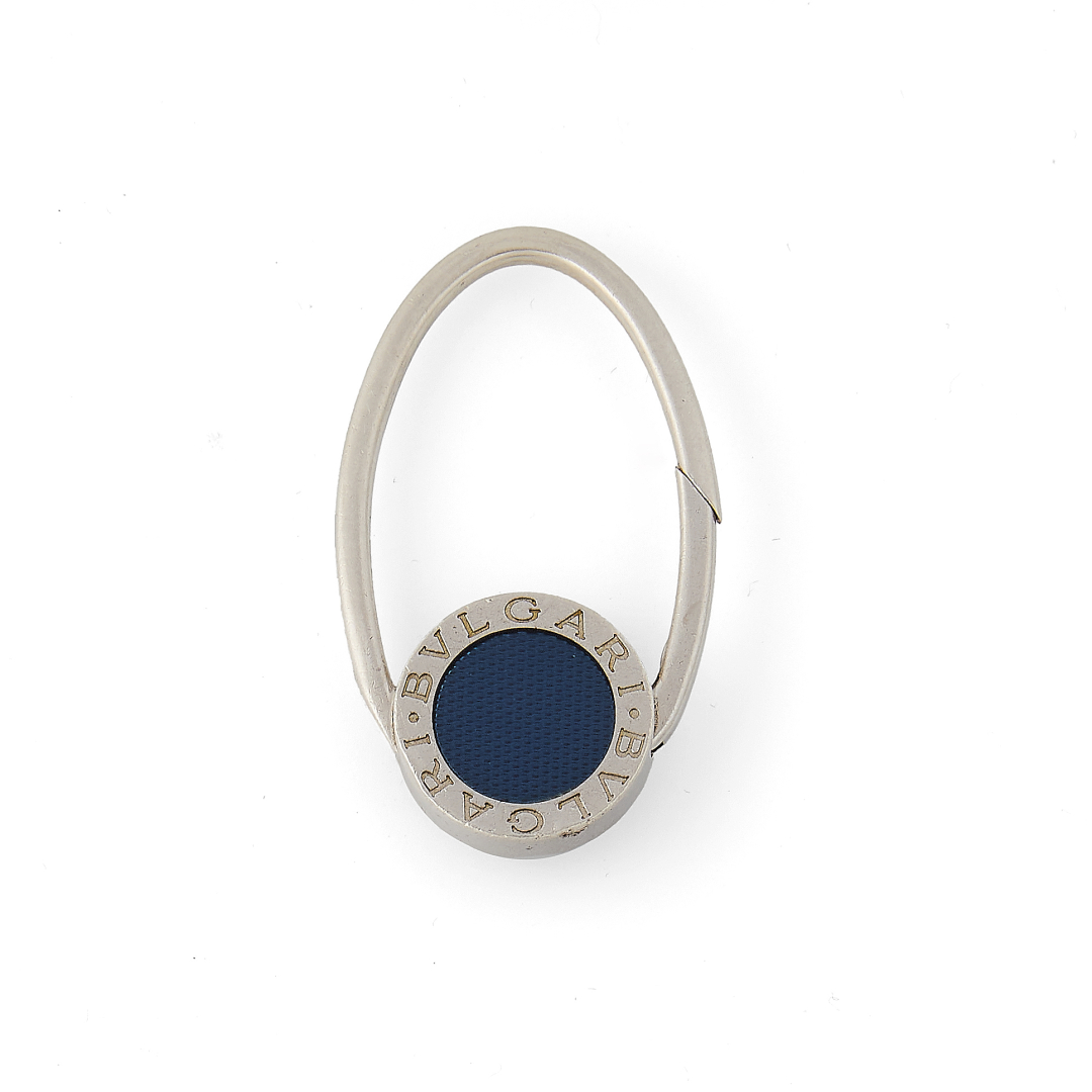 .925 silver with central logoed silver disc and iridescent blue polymer insert.