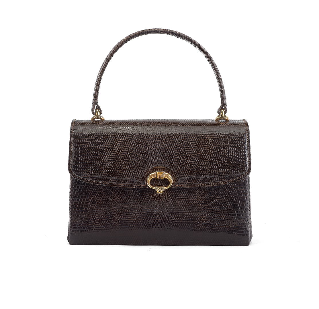 brown lizard leather, matching lambskin interior. Lizard handle. Flap closure with jewel detail and snap lock. Golden-tone metal hardware.