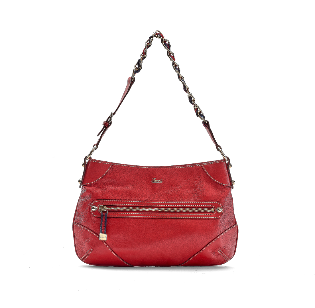 red leather, black fabric interior. Adjustable handle in leather and chain with Web stripe interlacing. Magnetic closure. A front zip pocket with logo pull tab. Golden-tone metal hardware.