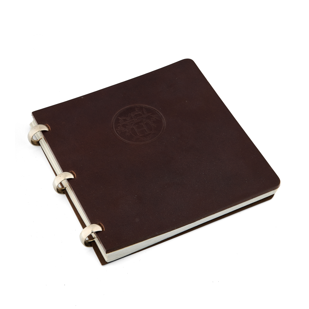 brown leather cover with central logo, binding with three silver-tone metal rings. Silver-edged pages.