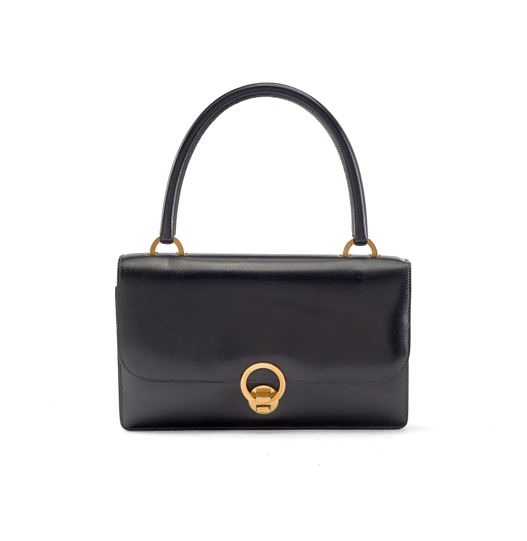 black Box leather, matching interior. Box leather handle. Flap closure with snap ring. Golden-tone metal hardware.