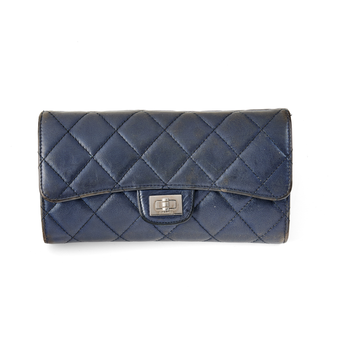 iridescent blue leather, iridescent leather interior. One bill compartment, six card slots, one coin pocket with snap button closure, four slip pockets. Flap with snap button closure and one rear patch pocket. Silver-tone metal hardware.