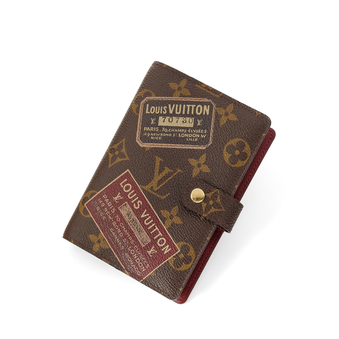 limited edition, in brown Monogram canvas with printed logo stickers. Burgundy leather interior lined with removable paper stickers, two flat pockets, three card slots, ring binder. Snap button closure. Golden-tone metal hardware.