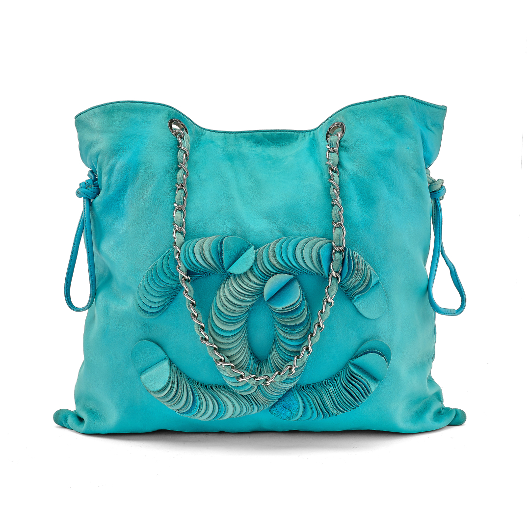 light blue leather, interior in pearl-grey striped fabric. Double chain handle with matching leather inserts. Magnetic closure and side drawstrings. Large CC logo on front composed of multiple leather discs. Silver-tone metal hardware.