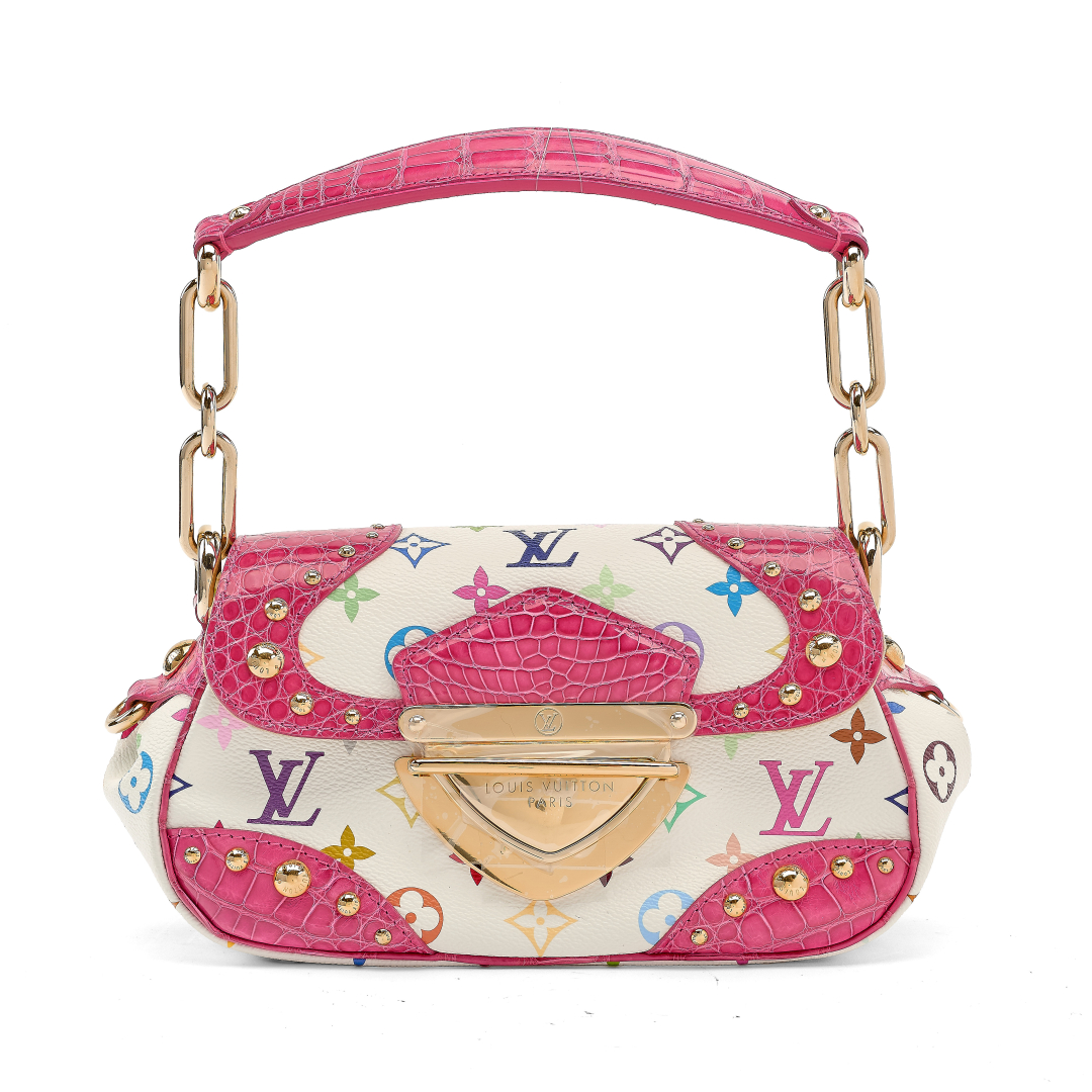 limited edition, designed by Takashi Murakami. In white multicolor Monogram canvas, designed by the Takashi Murakami. Fuchsia crocodile details and studs. Beige suede interior. Chain handle with crocodile shoulder pad. Front flap with snap closure, back slip pocket. Golden-tone metal hardware.