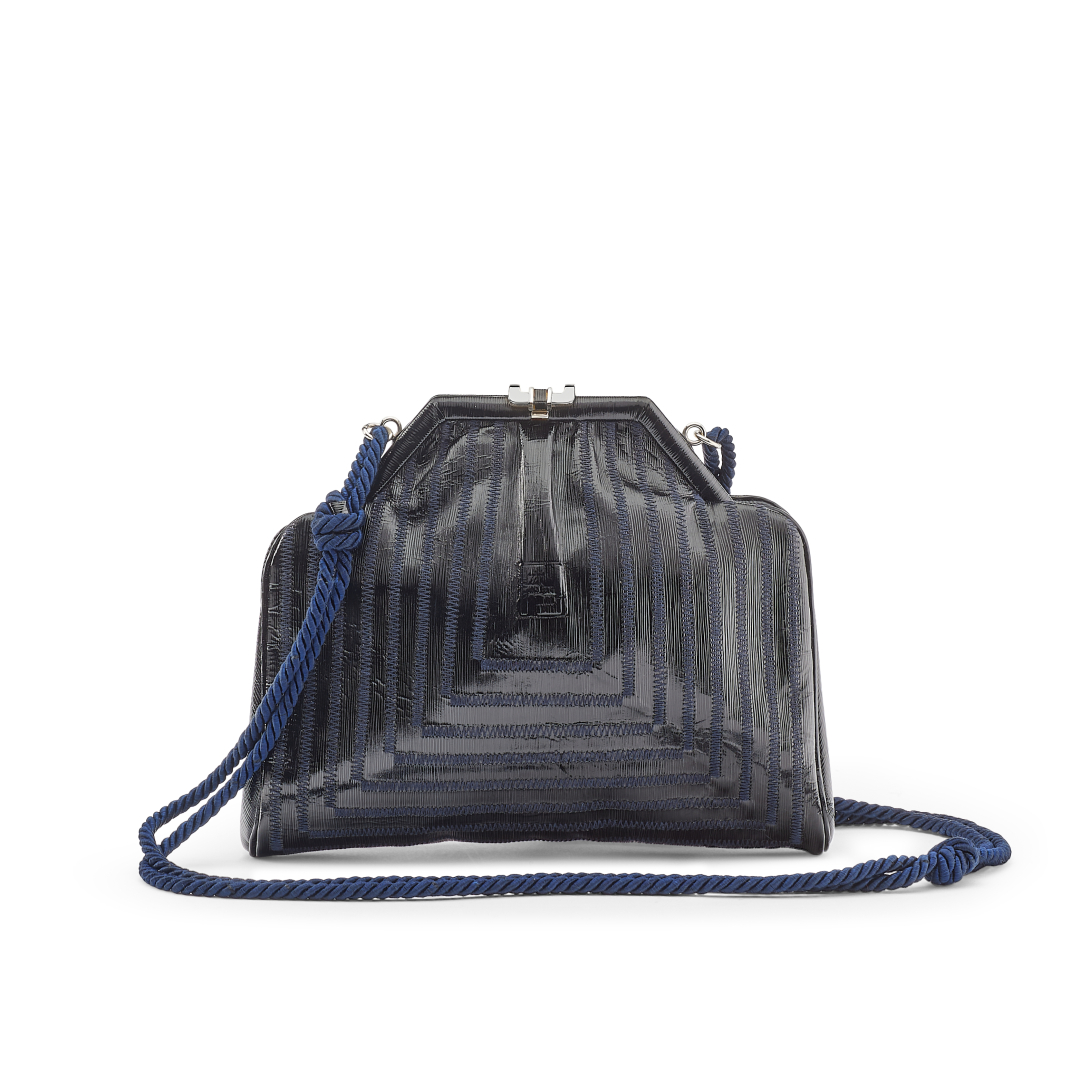 blue patent leather with matching zig-zag ornamental motif. Blue leather interior. Silk cord shoulder strap. Snap button closure. Silver-tone metal hardware.