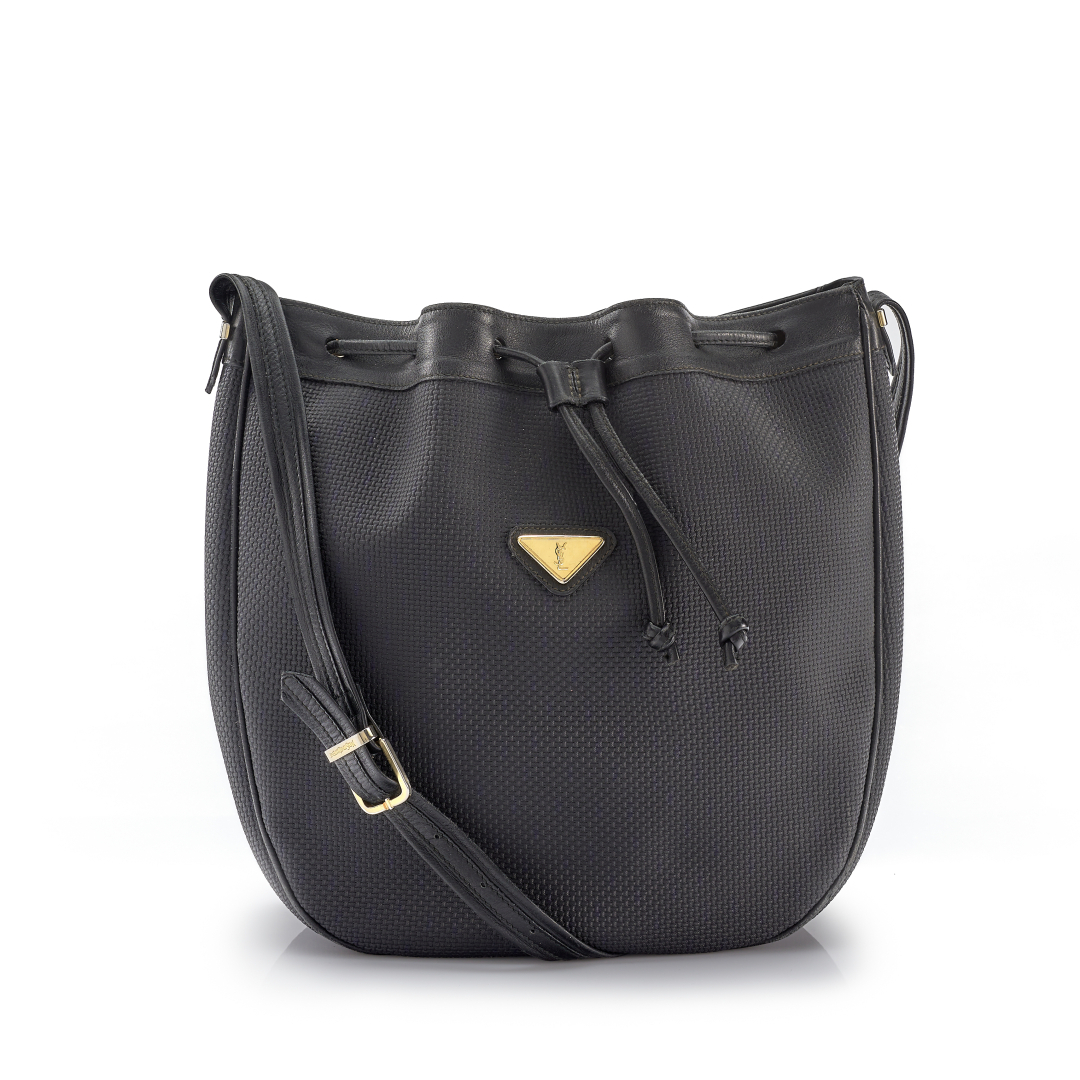 in black plasticized textured fabric. Lining with logo fabric. Adjustable handle and black leather inserts. Leather drawstring closure. Golden-tone metal hardware.