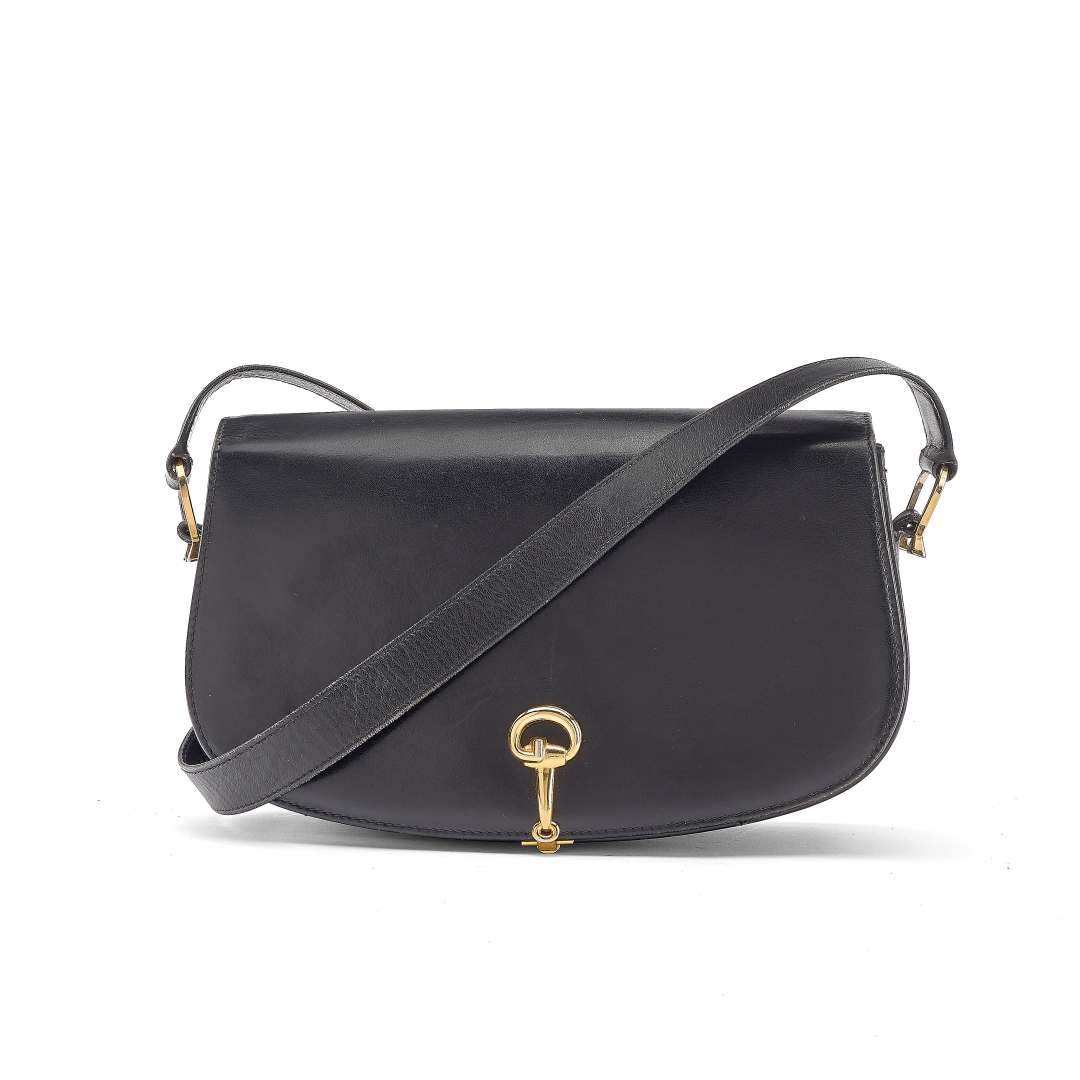 black leather with red leather lining. Leather strap. Flap closure with iconic Horsebit clasp forming the letter G. Golden-tone metal hardware.