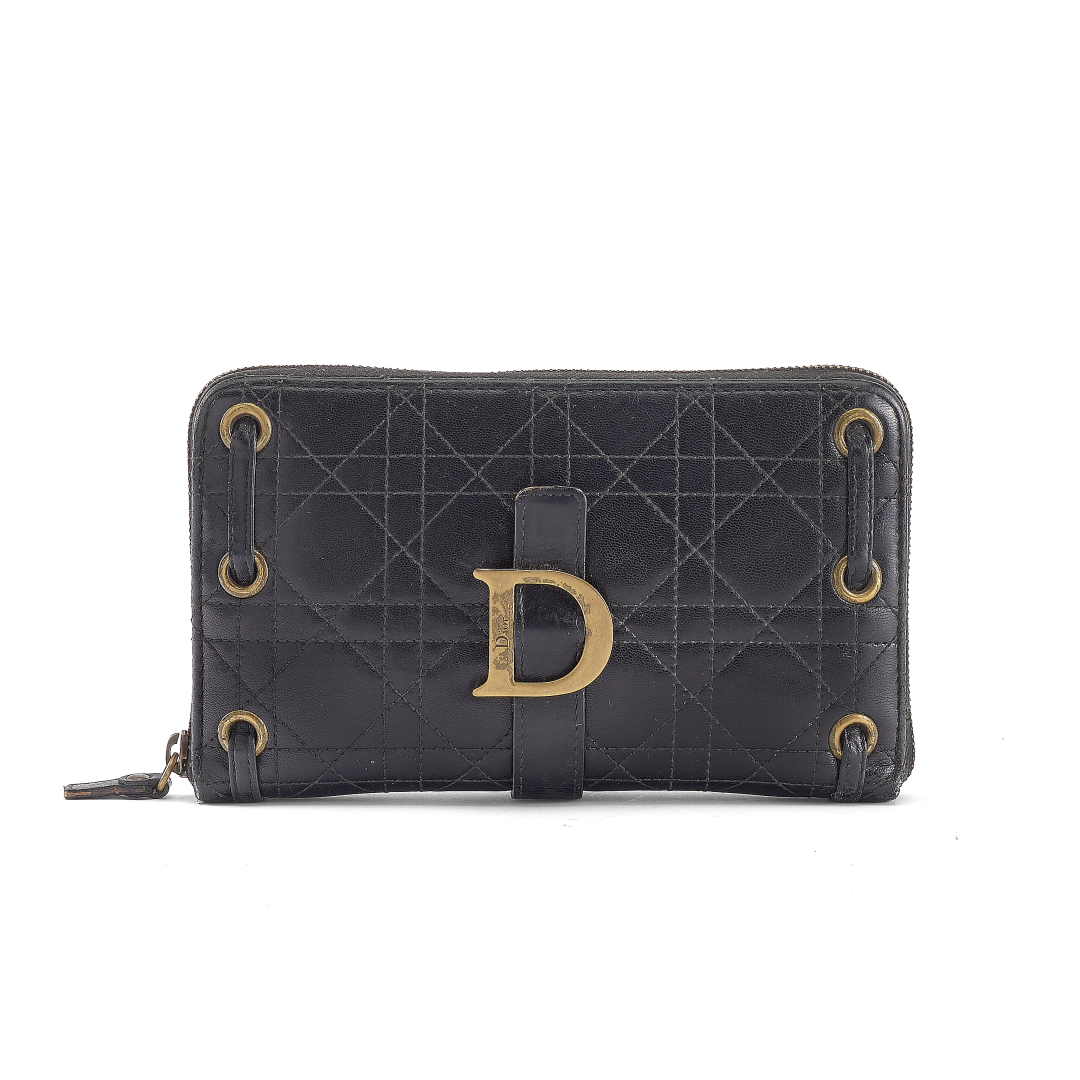 black lambskin with cannage stitching, red Dior Oblique leather and fabric lining. Two gusseted compartments, central zip pocket, twelve card slots. Large front metal logo. Zip closure. Golden-tone metal hardware.