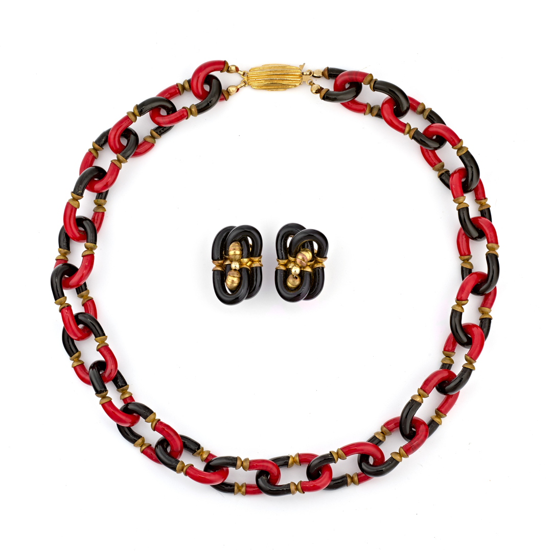 red and black Murano glass and gilt metal, composed of a necklace and a pair of clip earrings.
