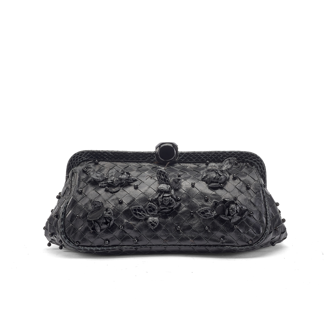 black Intrecciato leather with python and crystal details. Blue suede fabric lining. Black metal snap closure. Silver-tone metal hardware.