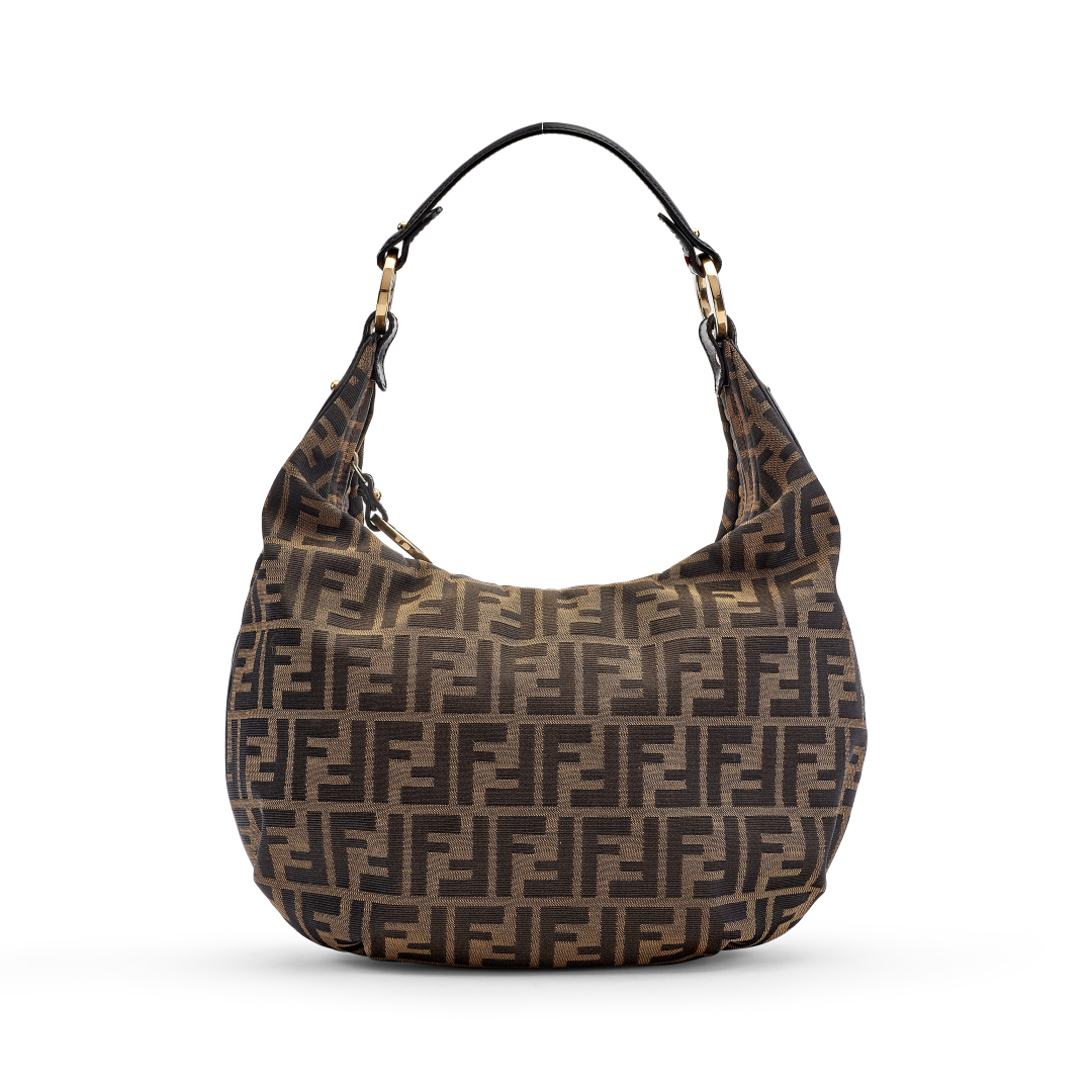 brown and bronze Zucca canvas with black leather handle and trim. Black logoed textile interior. Zip closure with logoed pull. Silver-tone metal hardware.