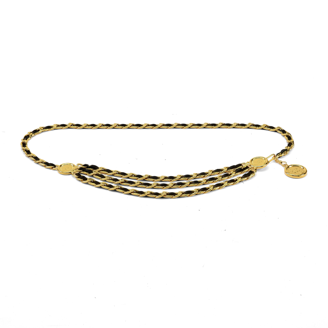 golden metal with triple chain design interlaced with black leather. Three logo medal charms, adjustable hook clasp signed Chanel.