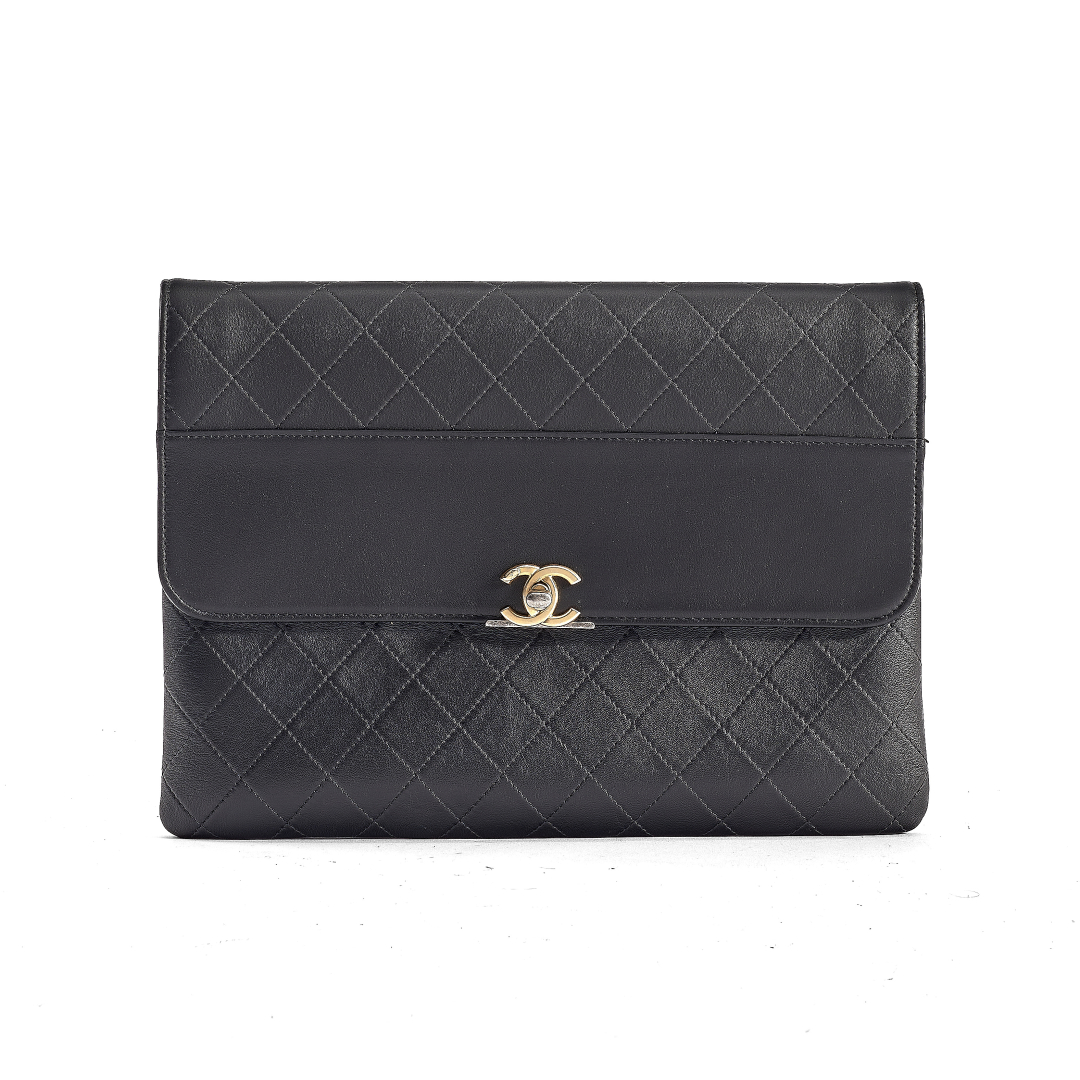 black quilted lambskin, burgundy grosgrain interior. Flap closure with turn-lock CC clasp. Golden-tone and burnished metal hardware.