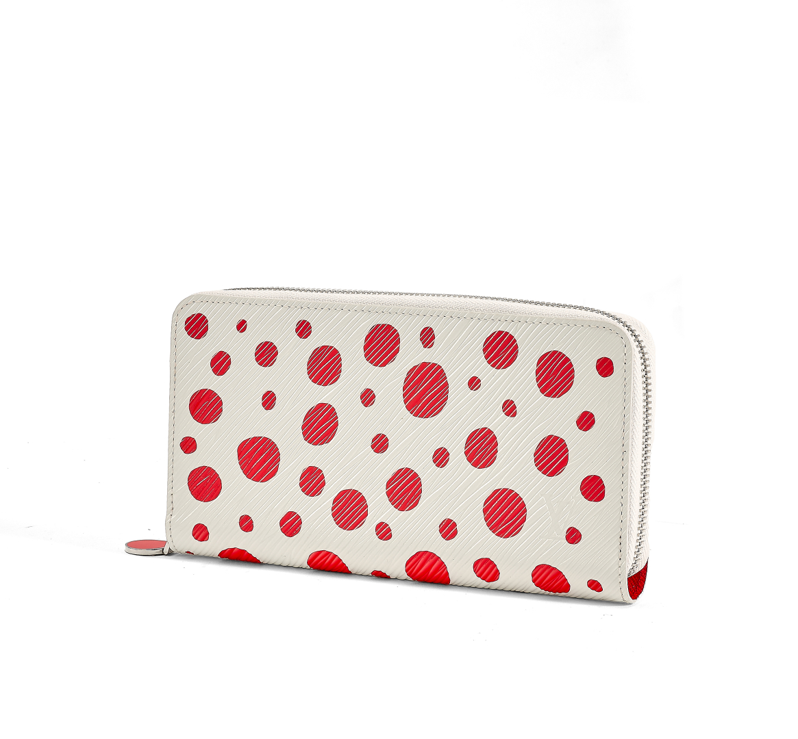 limited edition designed by Yayoi Kusama. In white Epi leather with red polka dots. Leather interior with four compartments, one zipped pocket, three flat pockets and twelve card slots. Zip closure with logo pull. Silver-tone metal hardware.