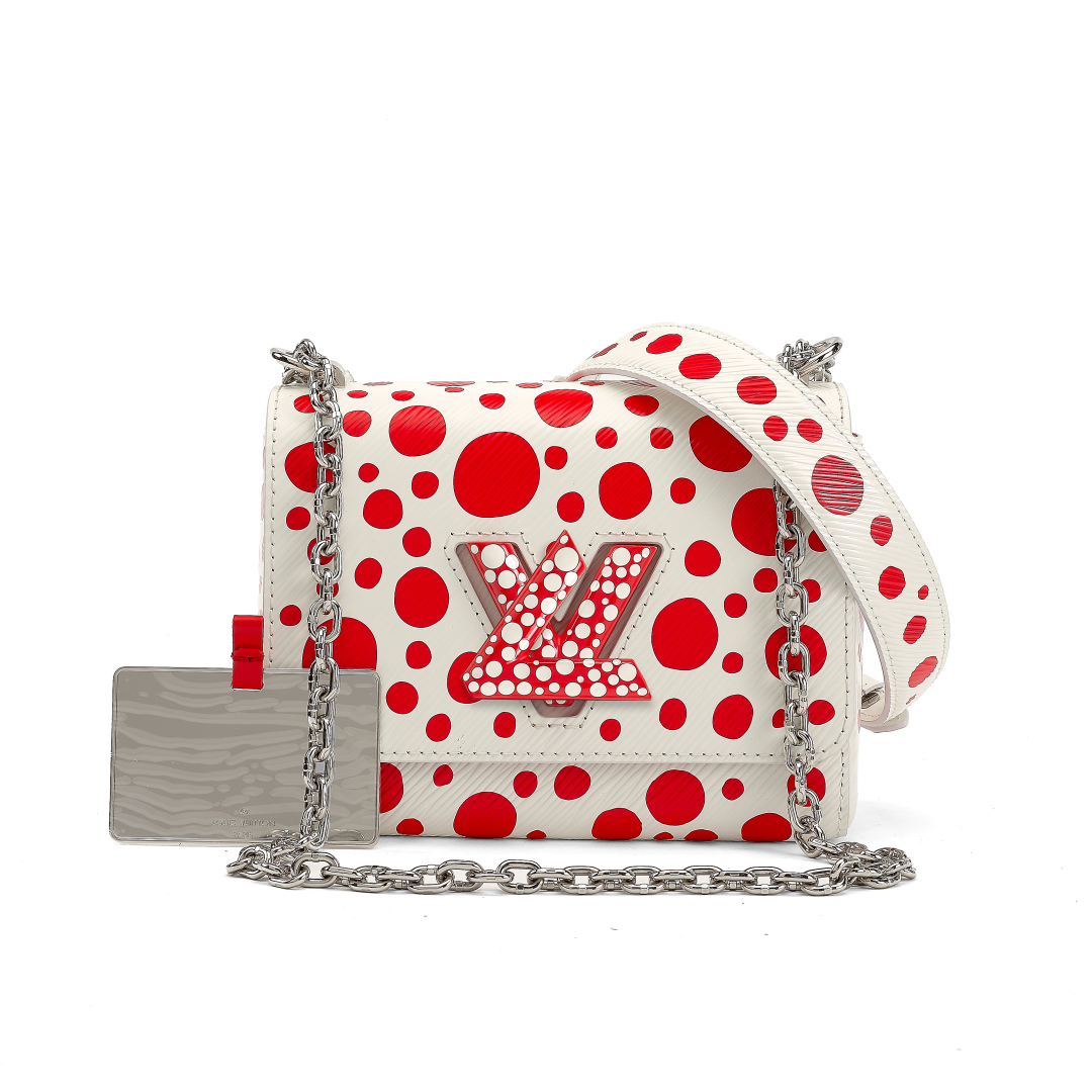 limited edition designed by Yayoi Kusama. In white Epi leather with red polka dots. Red leather interior. Iconic LV Twist Lock closure. Adjustable chain strap with white Epi polka-dot shoulder pad. Silver-tone metal hardware.
