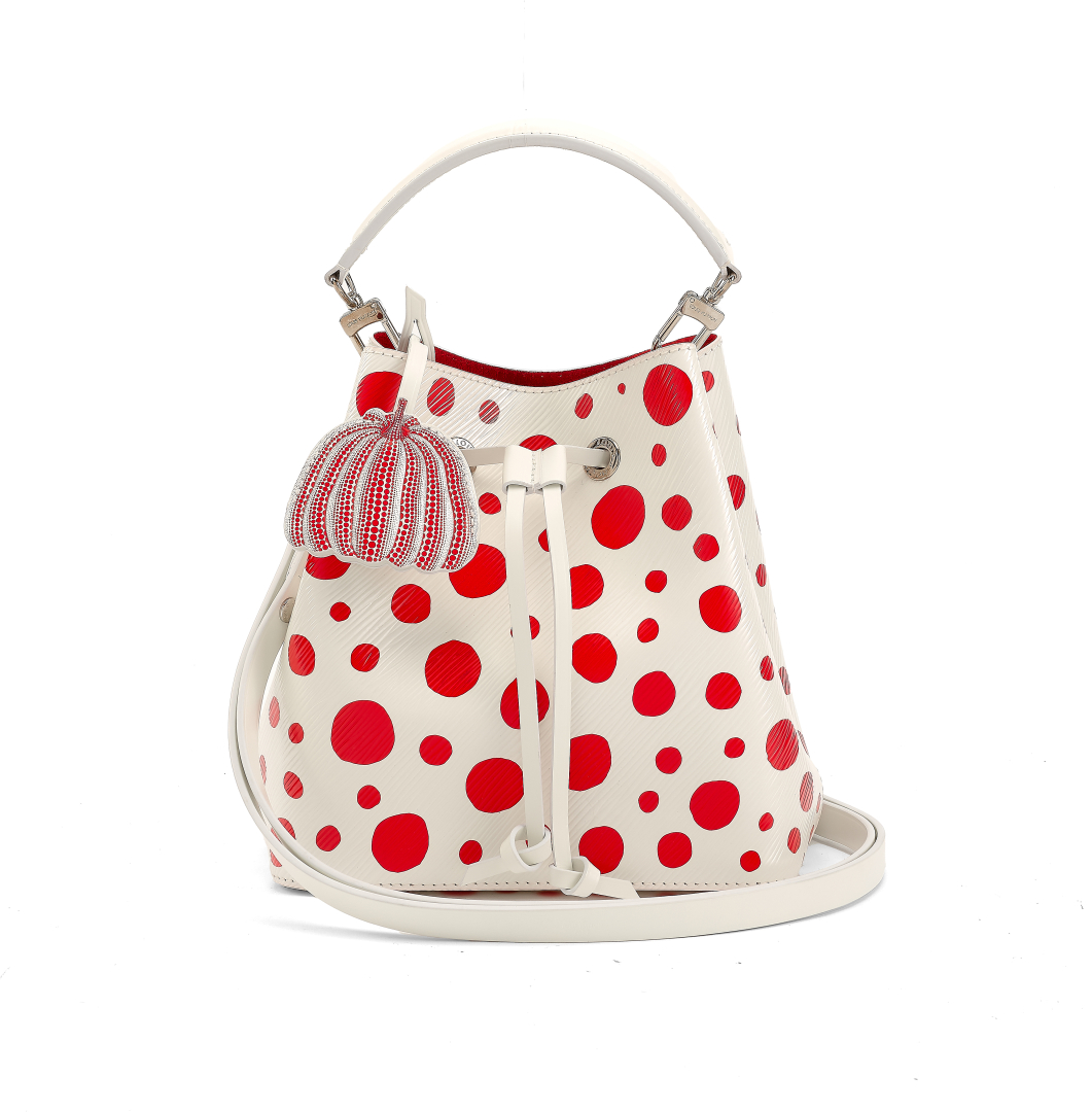 limited edition designed by Yayoi Kusama. In white Epi leather with red polka dots. Red suede interior. Removable handle and adjustable shoulder stap, removable white leather shoulder strap. Drawstring closure. Complete with detachable pumpkin-shaped key charm. Silver-tone metal hardware.