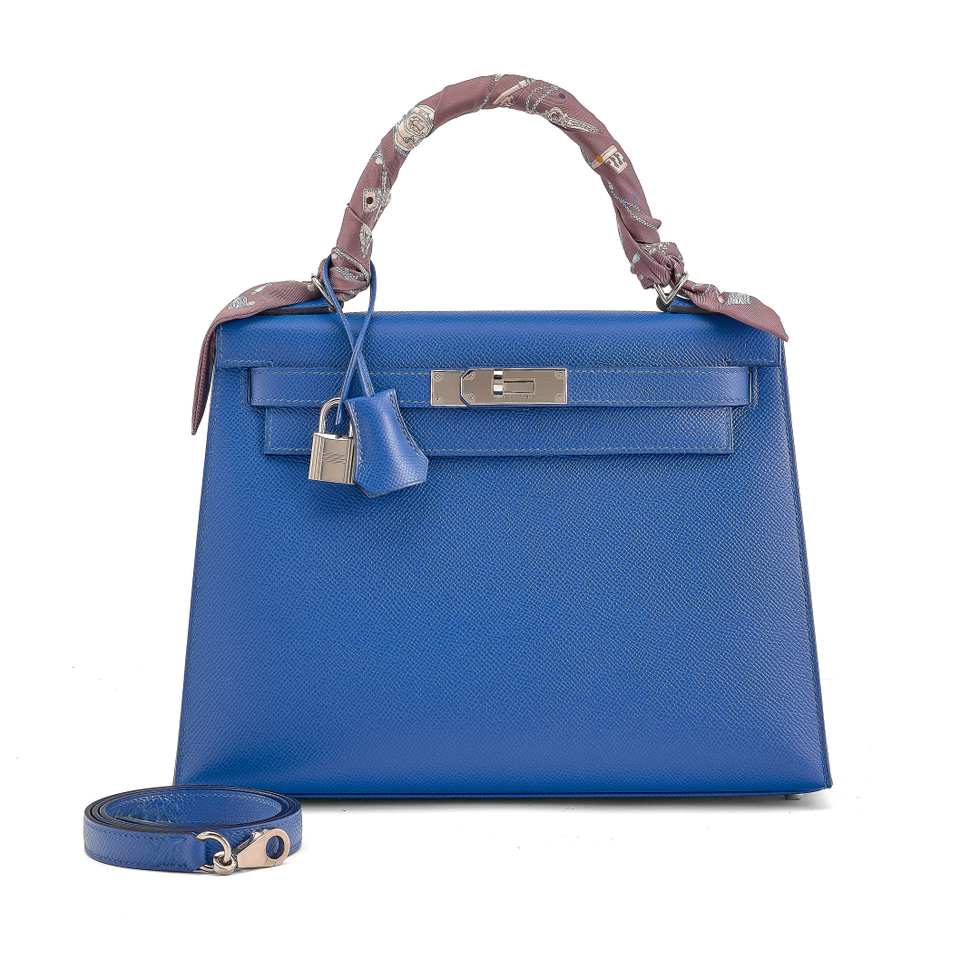 Epsom Bleu Royal leather. Comes with detachable shoulder strap, clochette with key set and padlock. Handle enhanced by Hermès Twilly scarf "Le Cles a pois". Palladium-plated hardware.