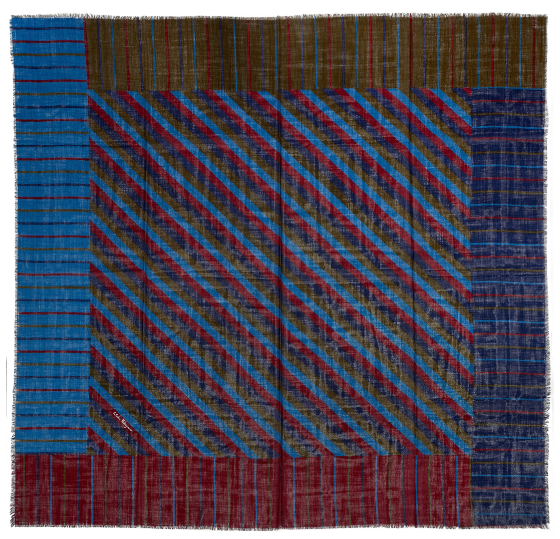 wool with graphic motifs in taupe, light blue, burgundy and navy tones.