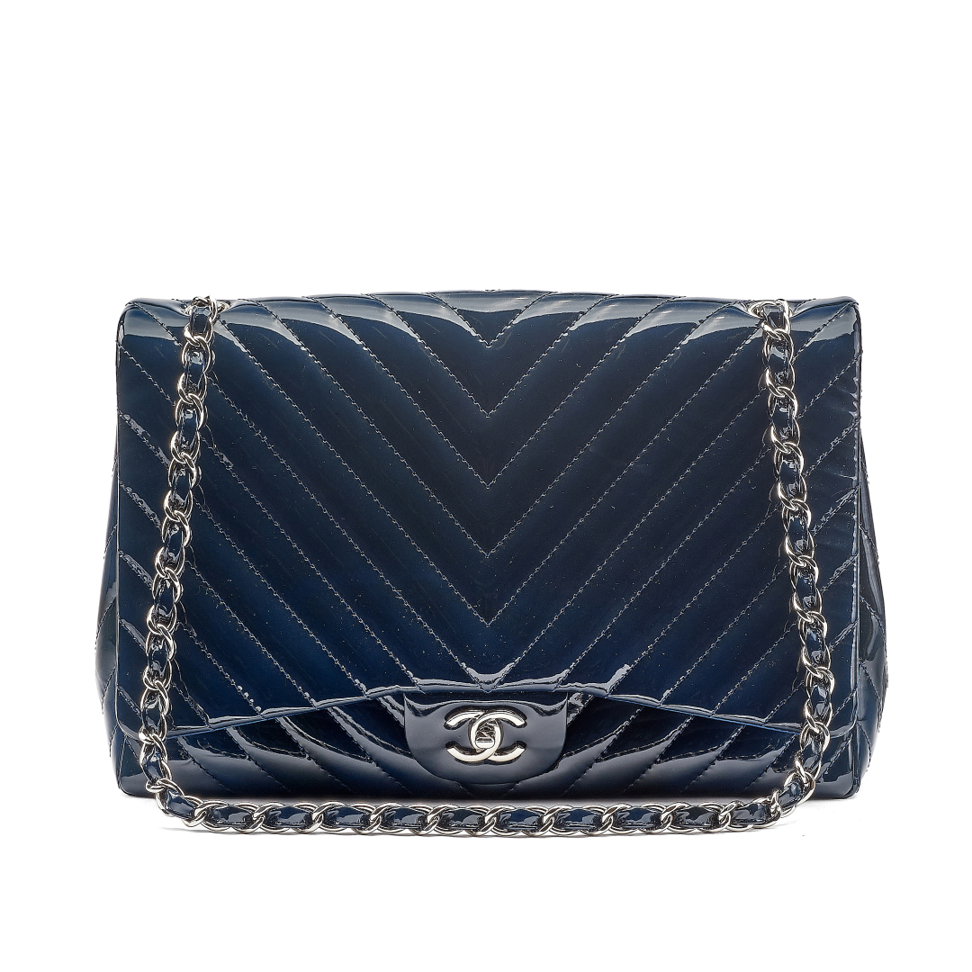 blue patent leather with herringbone quilting, blue leather lining. Double silver metal chain handle interlaced with blue patent leather. Flap with CC twist-lock closure. One patch pocket on the back. Silver-tone metal hardware.