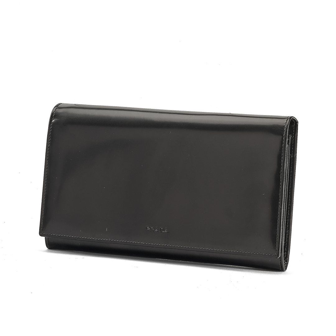 black brushed leather, black leather interior. Four compartments, one zipped. Two flat pockets, four card slots. Flap closure with logo push-lock clasp. Silver-tone metal hardware.
