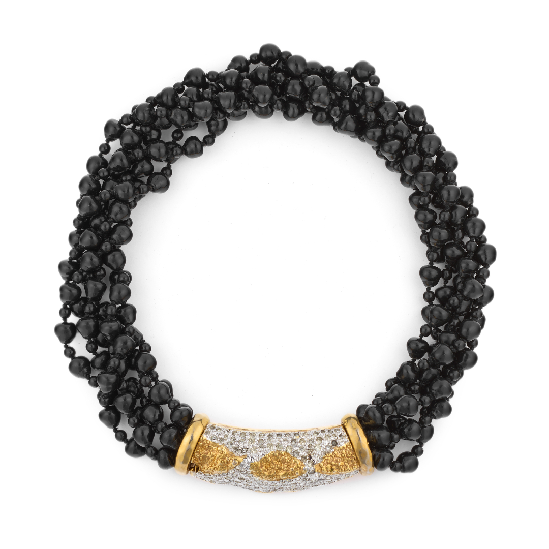 gilded metal, clear and grey crystals, and six strands of black resin pearls.