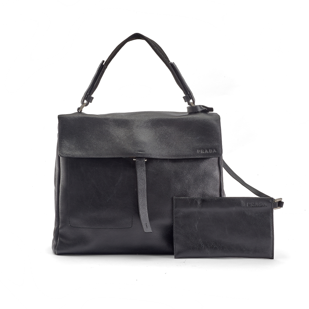 black leather with cotton and technical honeycomb fabric details. Matching honeycomb-textured black interior. Detachable cotton handle with leather details. Flap closure with magnet and velcro fastening. Comes with detachable black leather pouch secured with velcro. One rear drawstring pocket. Silver-tone metal hardware.