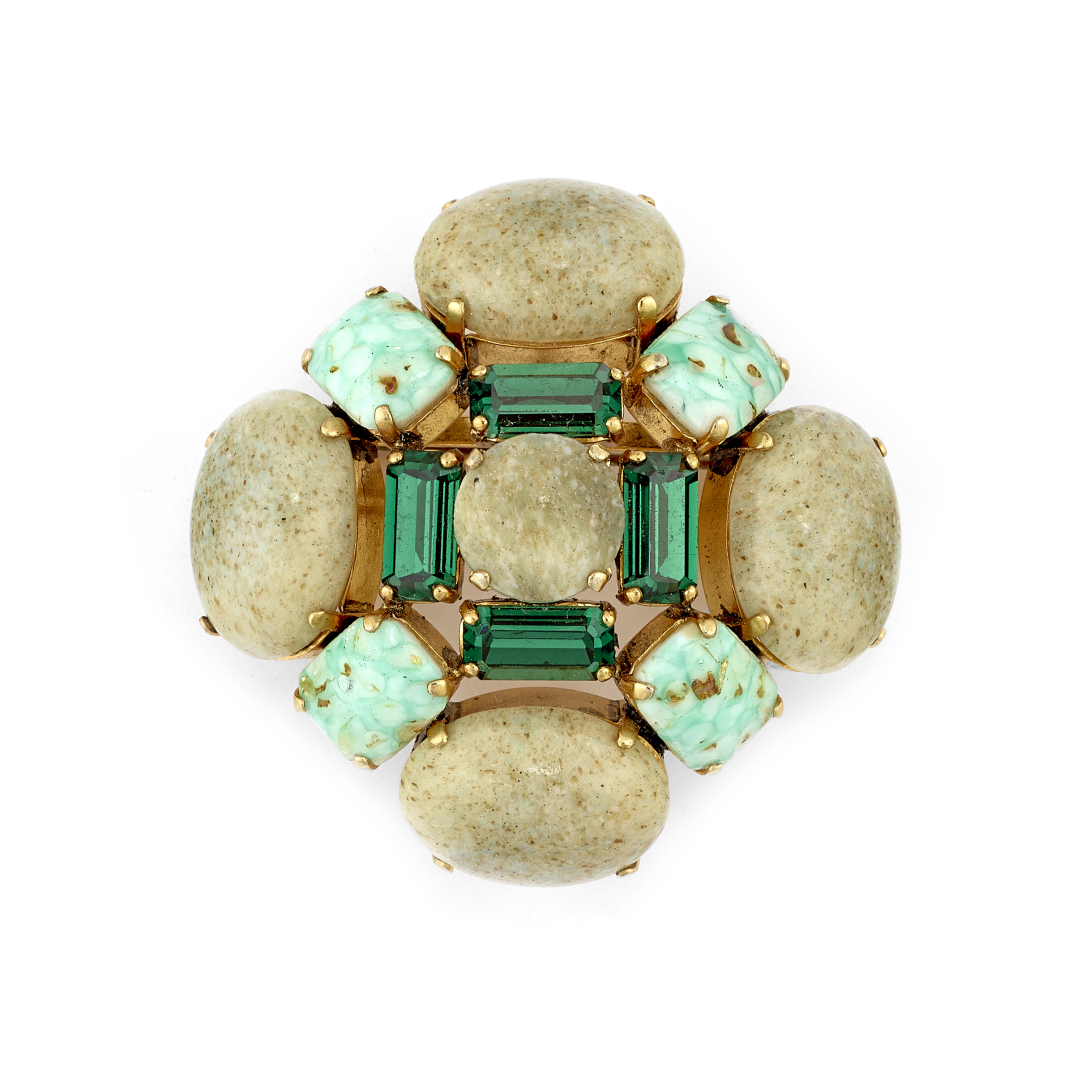 gilded metal, hard stones, glass paste and Swarovski crystals in shades of green. It dates from the period when Dior produced its jewels in Germany and were handmade by Henkel and Grosse.