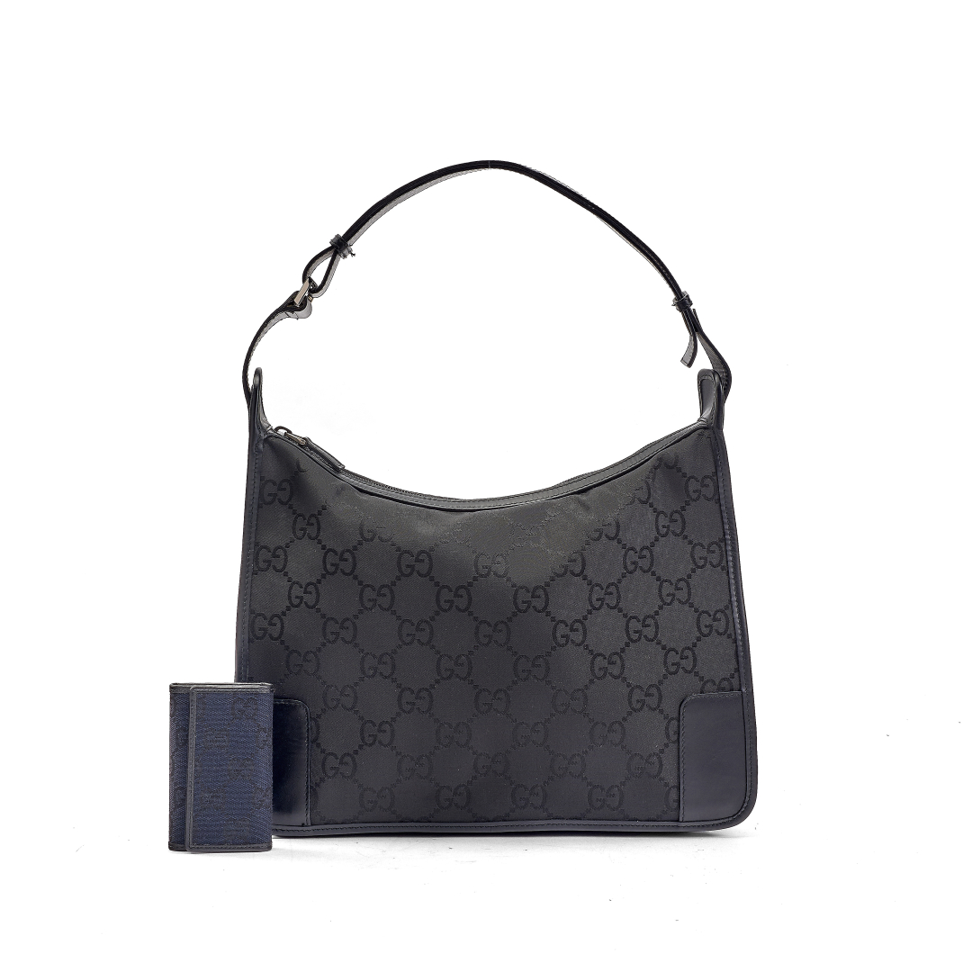 bag in glossy black GG canvas with leather details and black fabric interior. Adjustable leather shoulder strap, zip closure. Silver-tone metal hardware. The keychain in black GG canvas with leather details, black leather interior, six key hooks, snap button closure.