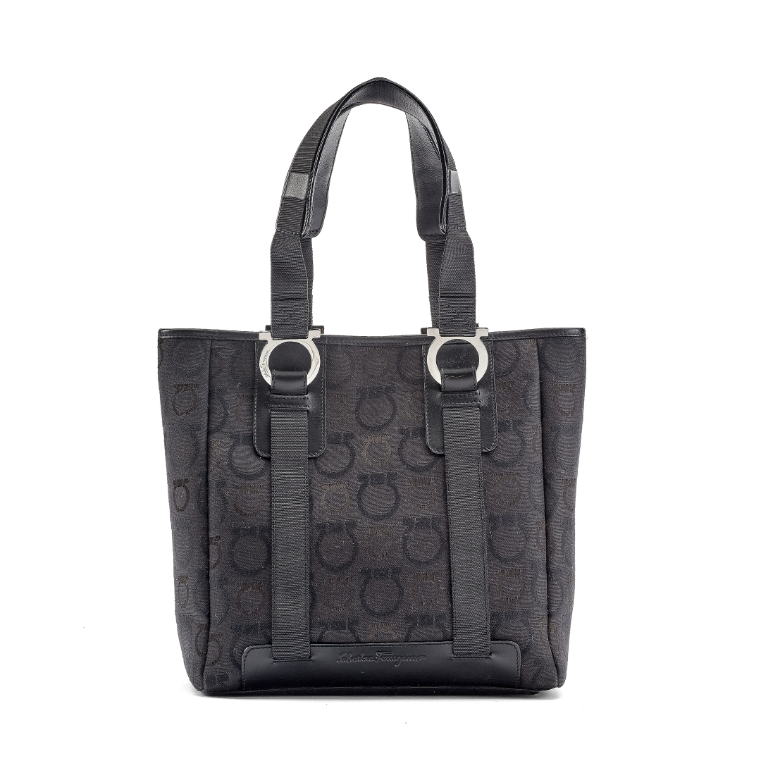 black logoed canvas with black leather and nylon ribbon details. Black grosgrain fabric interior. Double handle in leather and ribbon, magnetic closure. Silver-tone metal hardware.