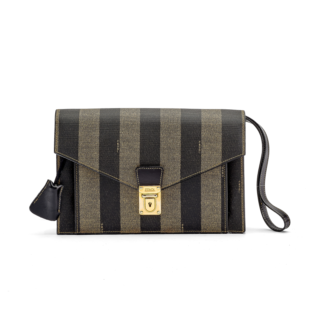Pequin leather with black leather details, black fabric lining. Removable black leather wrist strap. Flap closure with lock fastening. Removable clochette with key. One front pocket. Golden-tone metal hardware.