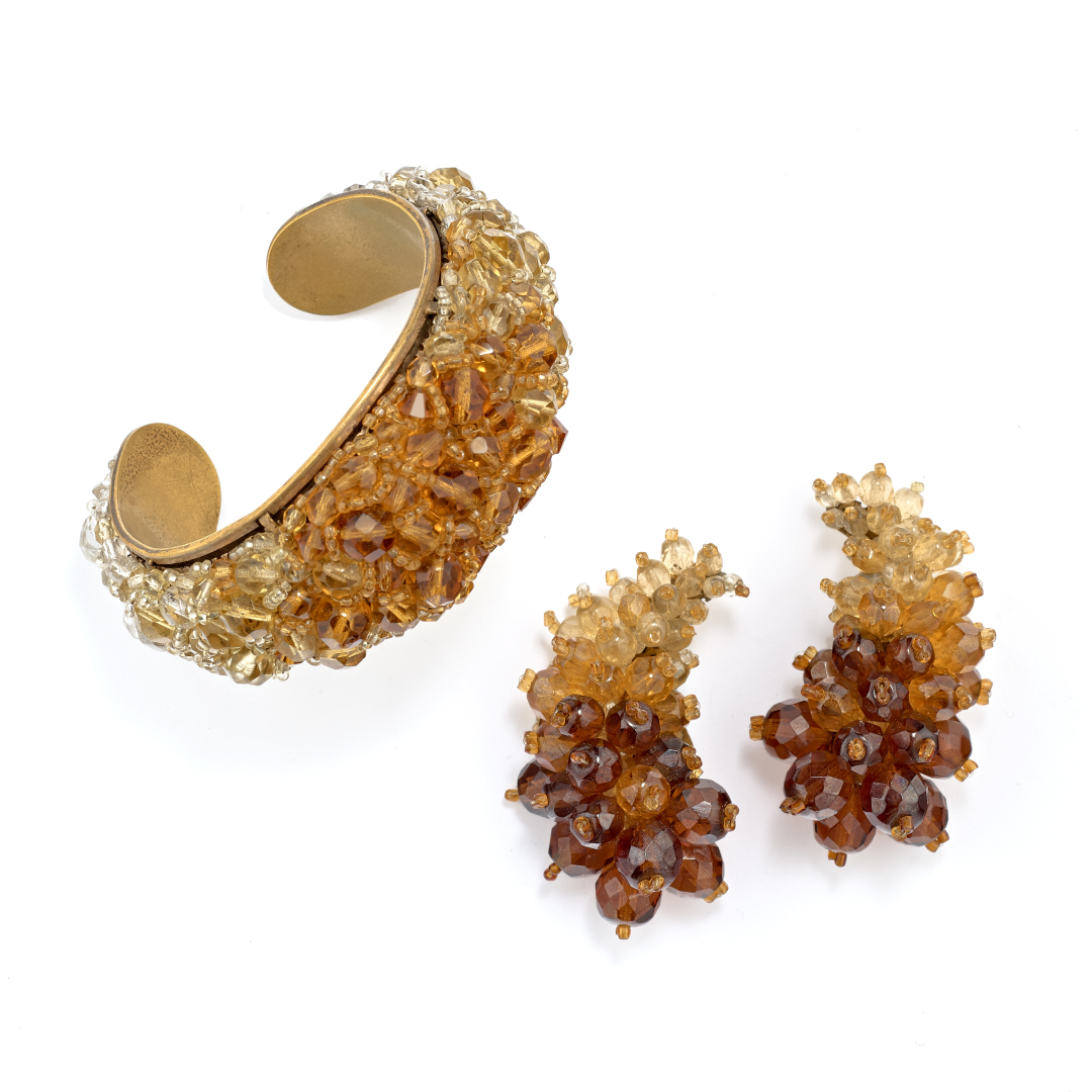 gilded metal, faceted half-crystal beads embroidered with pavé-style beadwork in bronze, honey and clear tones. Comprising a rigid bracelet and a pair of clip earrings.