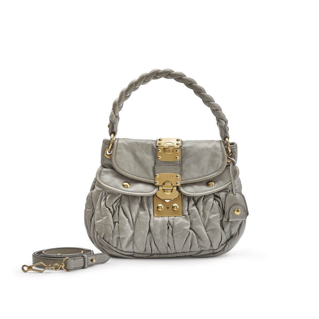 quilted light-blue leather, violet fabric interior. Braided leather handle and detachable leather shoulder strap. Flap closure with logoed turn-lock fastening. Complete with clochette and key. Two front pockets with flap and snap button closure. Golden-tone metal hardware.