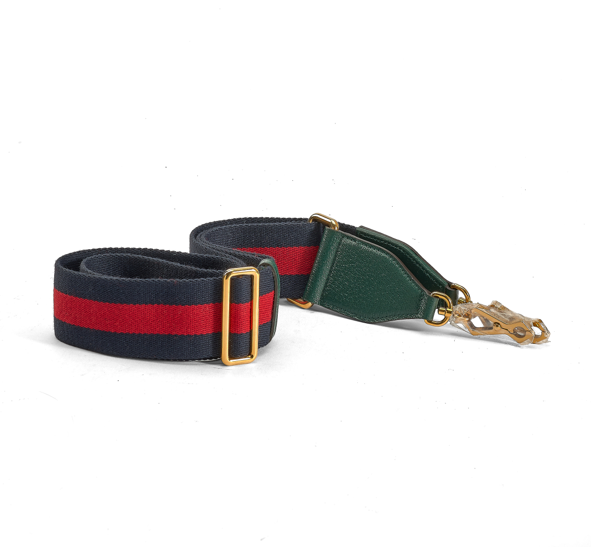 in green leather and iconic Web cotton stripe. Adjustable. Golden-tone metal hardware.