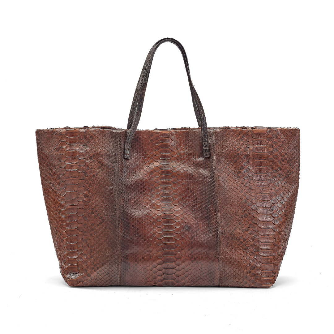 brown python, burgundy logo fabric interior. Double python handle. Magnetic closure.
