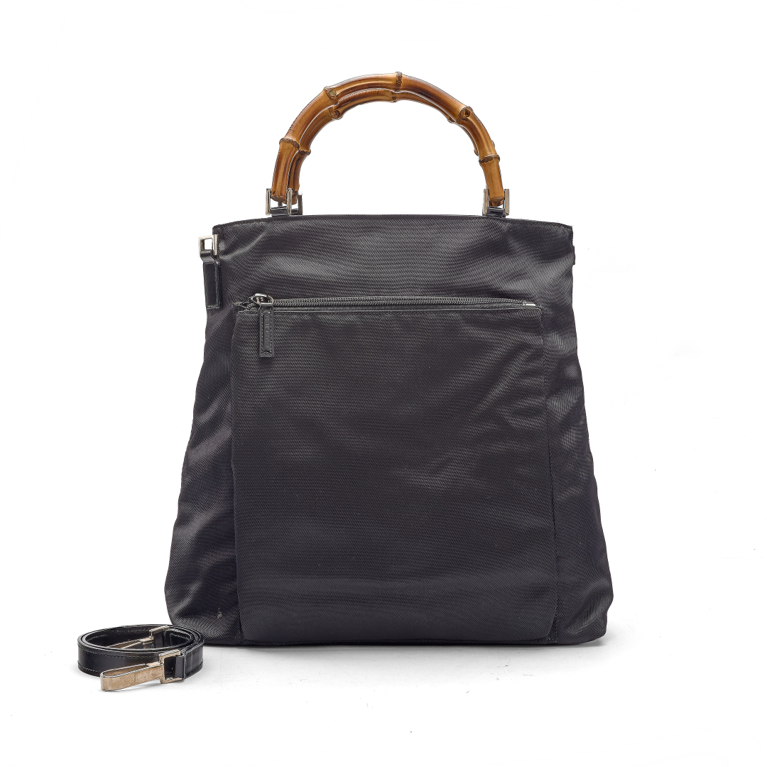 black technical fabric with matching leather details, black diamond-pattern fabric interior. Double bamboo handle and detachable black leather shoulder strap. Zip closure with logoed puller, one front zip pocket. Silver-tone metal hardware.