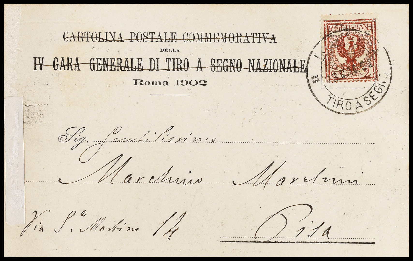 Annullamenti 1902 - Roma/Tiro a segno - Doppio cerchio annullatore di Floreale 2 c. su cartolina del 23 maggio dal campo di gara nazionale - Gara 150,00