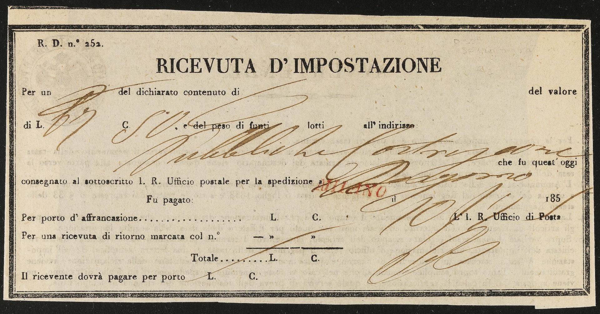 Storage and Shipment Until the full price has been paid and until delivery, lots are held in storage on the premises of Aste Bolaffi and insured with adequate coverage at the expense of Aste Bolaffi. On request, after payment has been made, lots can be shipped by insured parcel post at the risk and expense of the buyer. The possible export duties are also for the account of the buyer. Any export requests will be made by the auction house on behalf of the buyer to the appropriate government offices. The buyer will be required to pay all costs on receipt of the invoice.