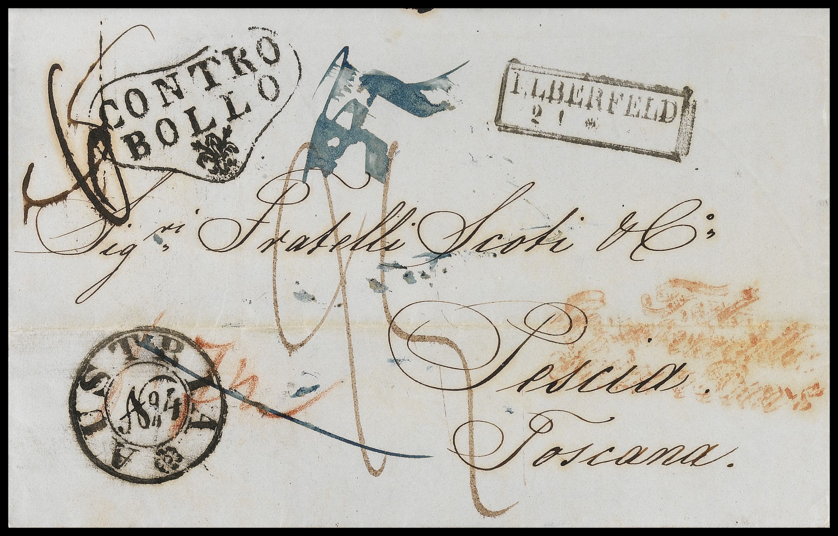 Oltremare Victoria Unfranked letter dated 2 January from Elberfeld (Germany) to Pescia (Italy) with heart-shaped "Counter/stamp" and double circle "Austria no. 4"