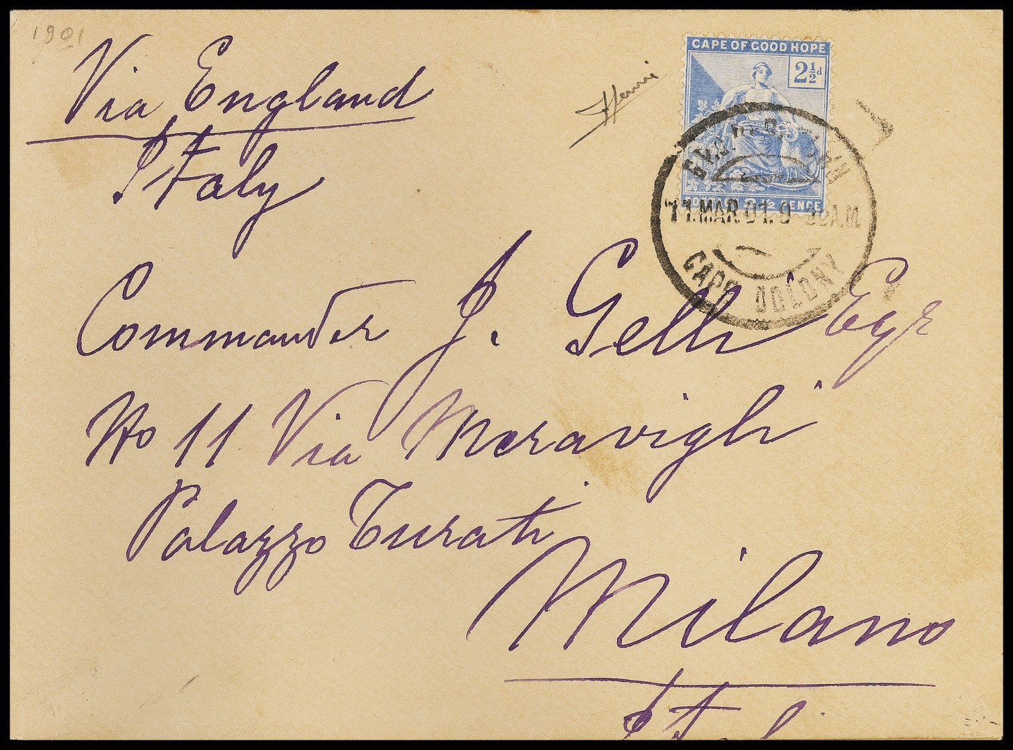 Overseas Cape Of Good Hope Allegory 2 1/2 p. overseas on envelope dated 11 March 1901 from Cape Town to Milan via England Signed Sorani (Yv. n. 48) 100,00