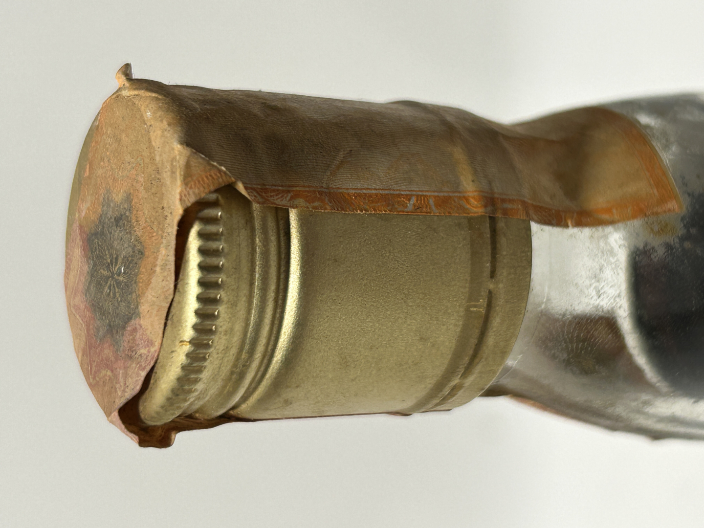 High fill, stained label, metallic cap