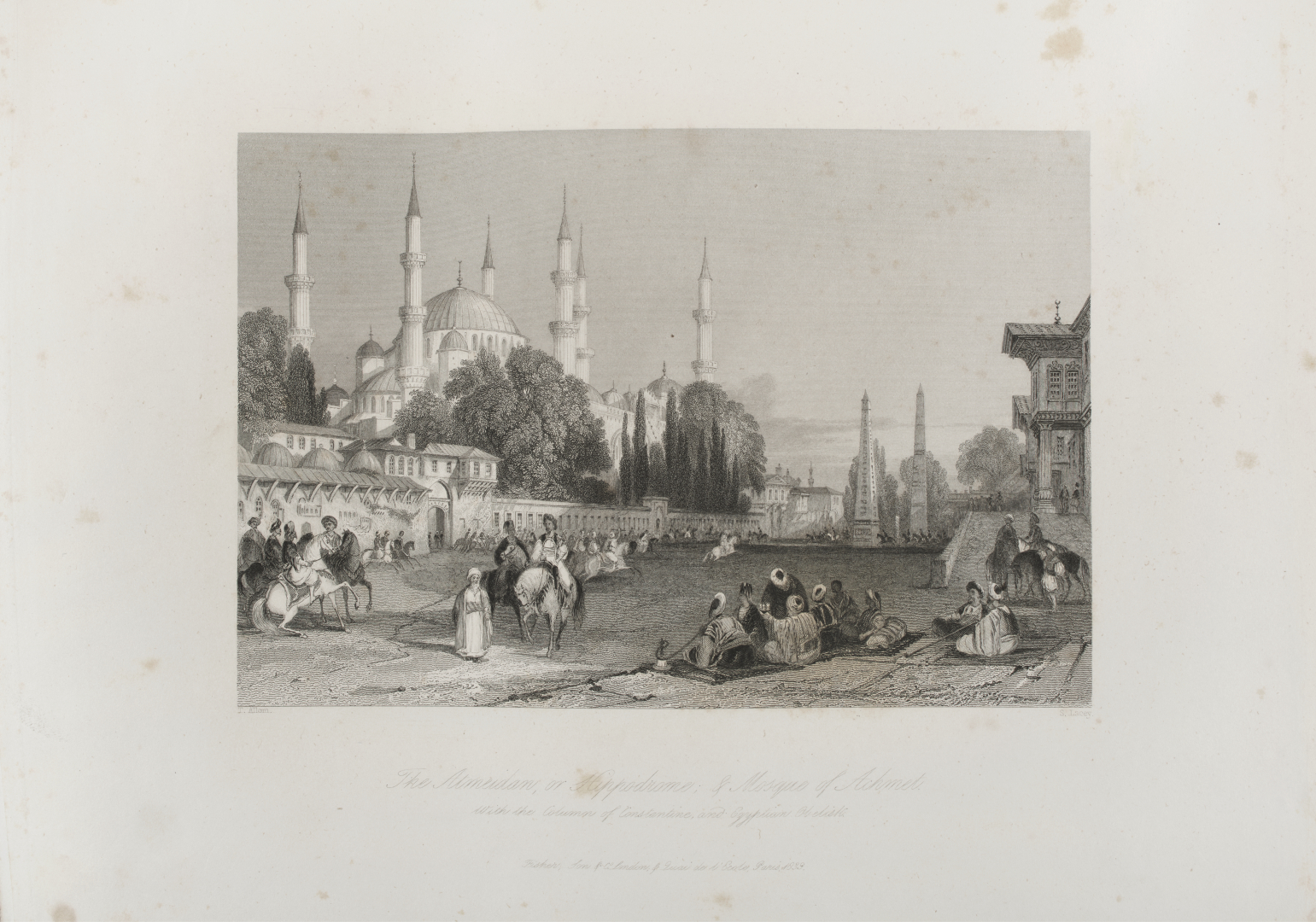 [Costantinopoli]. Piccolo gruppo di volumi dedicati alla città sul Bosforo, formato da Costantinopoli effigiata e descritta di Antonio Baratta del 1840, con numerose tavole incise in rame, protette da velina e raffiguranti i principali monumenti, gli usi e i costumi locali, entro legatura in mezza pelle con fregi e titolo in oro al dorso; Historia universale dell'origine et imperio de Turchi di Francesco Sansovino, impressa da Stefano Zazzara a Venezia nel 1568 e La turca in cimento o sia L'avventure di Zelmira di Antonio Piazza nell'edizione veneziana del 1765, 2 tomi in 1 volume, rilegato in mezza pelle con titolo in oro e fregi fitomorfi al dorso, tagli rossi.