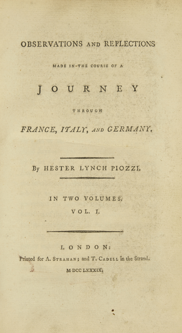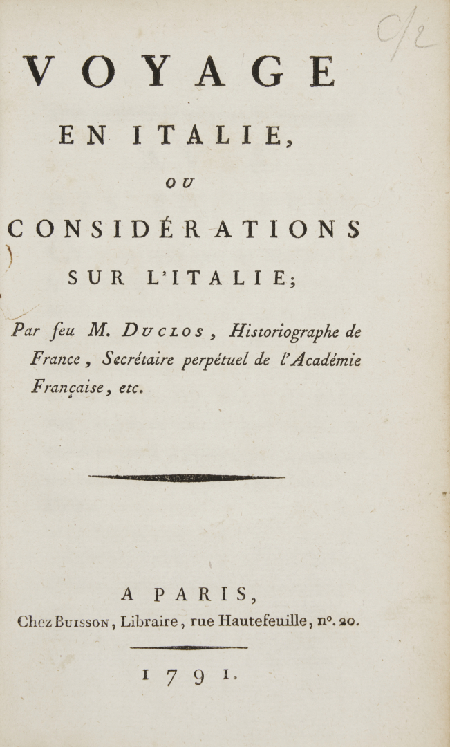 [Grand Tour]. Esemplare fresco della seconda edizione Voyage en Italie ou considérations sur l'Italie di Charles Pinot Duclos del 1791, entro legatura coeva in pelle spugnata con titolo in oro su tassello al dorso. Hoefer XV, 22: "Ce voyage est remarquable par l'originalité des vues et des aperçus; Duclos ne pouvait parcourir l'Italie en simple touriste, il la visita en penseur et en politique". Nel lotto un bell'esemplare del volume Twenty four select views in Italy di W.B. Cooke del 1833 con tavole litografiche incollate, entro bella legatura coeva in marocchino color testa di moro con ricca decorazione in oro ai piatti e al dorso con ex libris di Robert B. & Marian S. Honeyman e tassello della libreria antiquaria Rappaport, Roma. Sono inoltre inclusi i due volumi del diario del viaggio di nozze intrapreso nel 1784-85, poco prima della Rivoluzione Francese, da Hester Lynch Salusbury e il suo secondo marito Gabriele Piozzi, musicista, in Francia, Italia e Germania, intitolato Observations and Reflections Made in the Course of a Journey through France, Italy and Germany nell'edizione londinese del 1789.