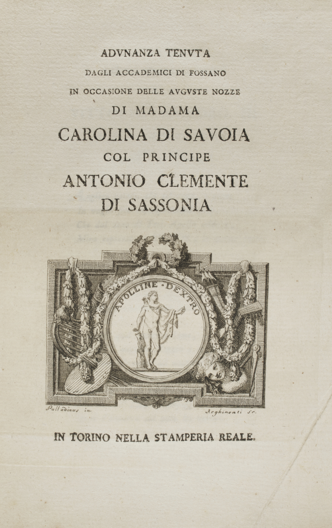 ADUNANZA TENUTA DAGLI ACCADEMICI DI FOSSANO IN OCCASIONE DELLE AUGUSTE NOZZE DI MADAMA CAROLINA DI SAVOIA COL PRINCIPE ANTONIO CLEMENTE DI SASSONIA.