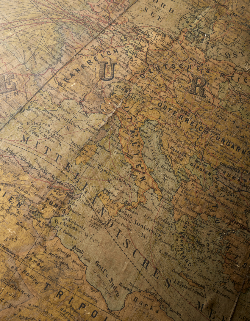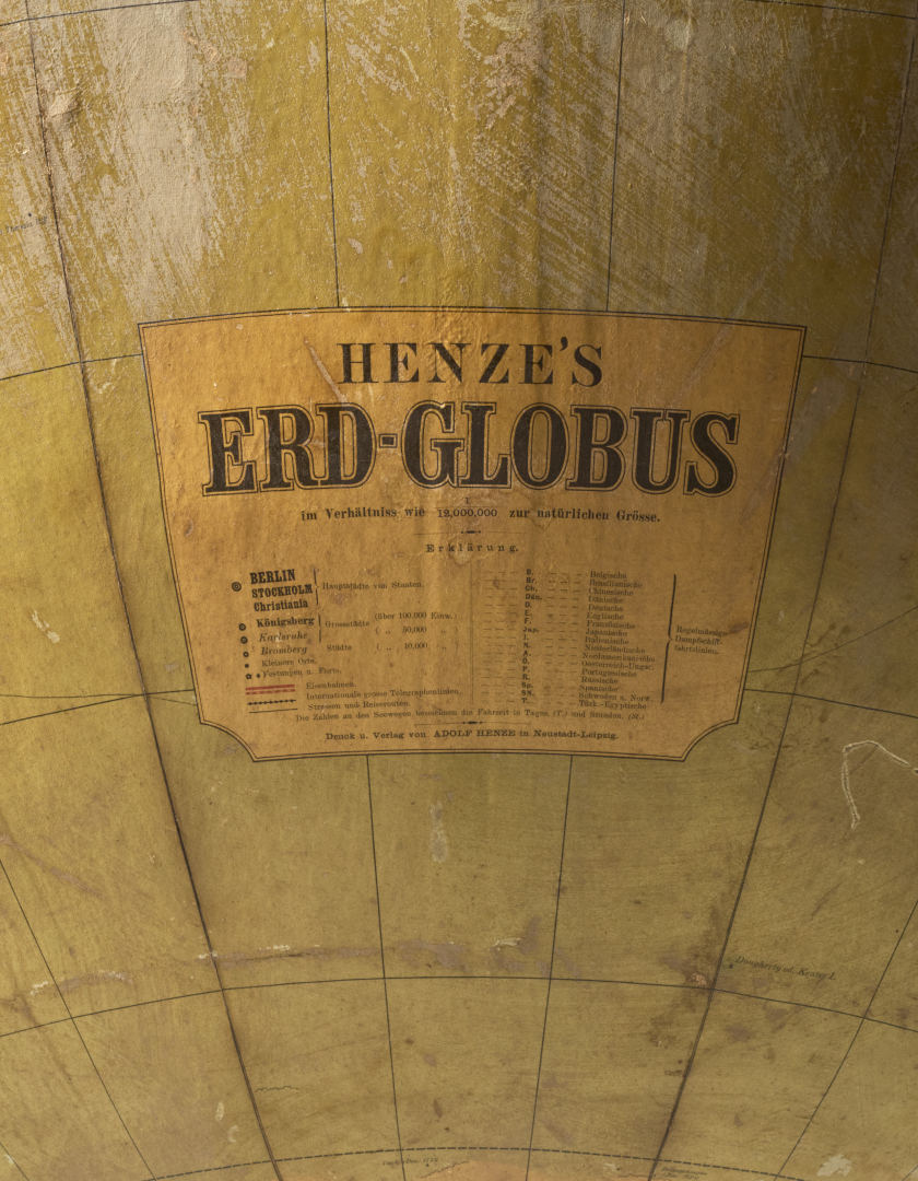 [Globo]. Rarissimo grande globo da biblioteca di Adolf Henze (1814-1883) del 1889 circa, pubblicato come il più grande globo commerciale mai realizzato. Adolf Henze era un editore tedesco del periodico "Illustrierter Anzeiger für Contor und Bureau". Per incoraggiare gli abbonamenti, includeva spesso supplementi gratuiti come mappe e tabelle di conversione. Tra il 1885 e il 1890, gli abbonati potevano collezionare 24 semisfere stampate e due calotte polari per il monumentale Erd-Globus di Henze, dal diametro di 106 cm. A pagamento, chi possedeva un set completo poteva richiedere un kit di montaggio pneumatico o far montare il globo da un professionista su due emisferi uniti e una base a piedistallo. Il globo reca il cartiglio Henze's Erd-Globus im Verhältniss wie 1:12.000.000 natürlichen Grösse. Druck u. Verlag von Adolf Henze a Neustadt-Lipsia. Si presenta montato come fornito dall'editore su due emisferi, fissati con quattro giunti a vite, asse centrale sostenuto da supporto in legno, altezza di 175 cm e 106 cm di diametro (manca il pomello in alto, piccole mancanze e difetto in alto). Verosimilmente uno dei pochissimi esemplari sopravvissuti.