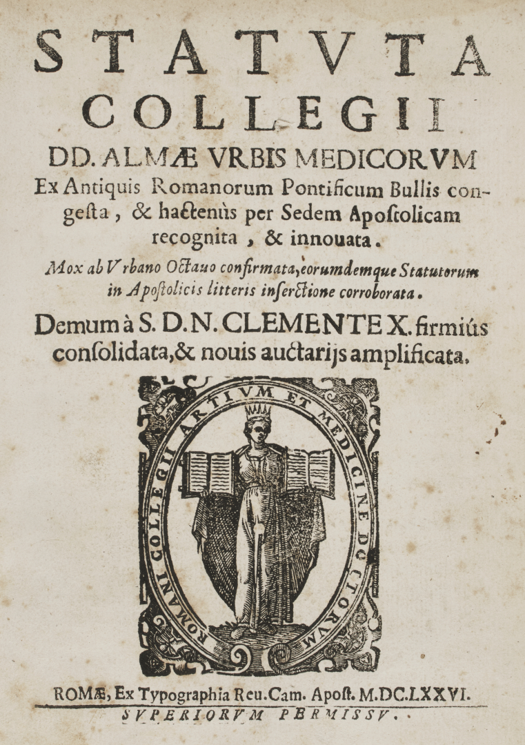 [Collegio dei Medici di Roma]. Lotto che contiene la rara pubblicazione Statuta Collegii DD. almae urbis Medicorum ex antiquis romanorum pontificum bullis congesta ... Demum a S.D.N. Clemente 10. firmius consolidata, & novis auctarijs amplificata nell'edizione romana della Stamperia Camerale del 1676 con grande vignetta al frontespizio, entro legatura coeva in pergamena con titolo in oro su tassello al dorso liscio.