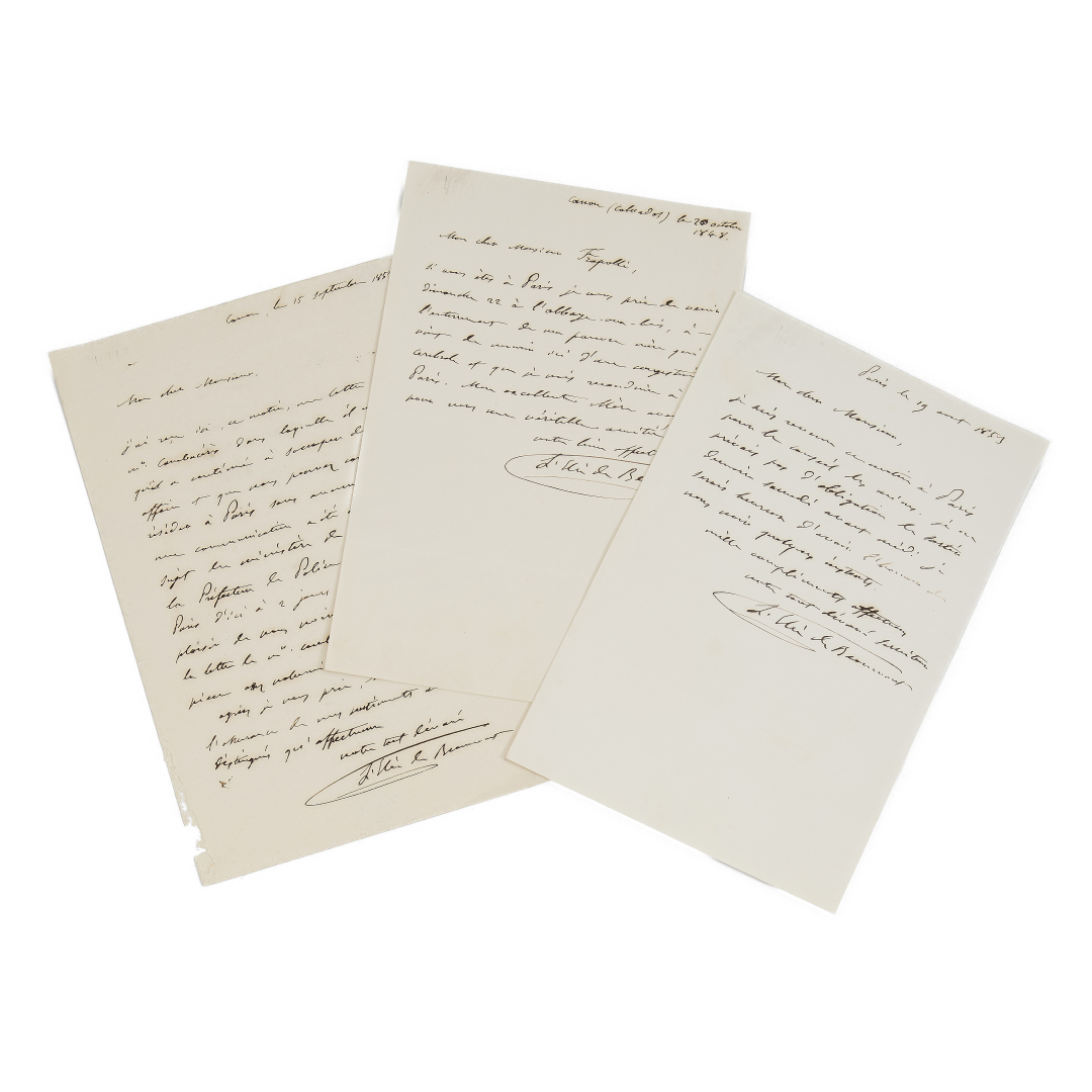 Elie de Beaumont, Jean-Baptiste. Interessante set composto da 4 lettere autografe (in 8°) firmate del geologo francese, professore all’École des  Mines e grande ufficiale della Legion d’Onore, tutte dirette a un “Cher Monsieur” dal 20 ottobre 1848 al 15 settembre 1853. Allegate due partecipazioni funebri a stampa datate 21-22 ottobre 1848 di Madame Eleonore Elie de Beaumont, madre dell’accademico, nonché un volume a stampa Rapport sur les progrès de la stratigraphie par M. L. Élie de Beaumont pubblicato a Parigi nel 1869 con dedica autografa dello stesso autore. Bell’insieme, tutto da studiare!