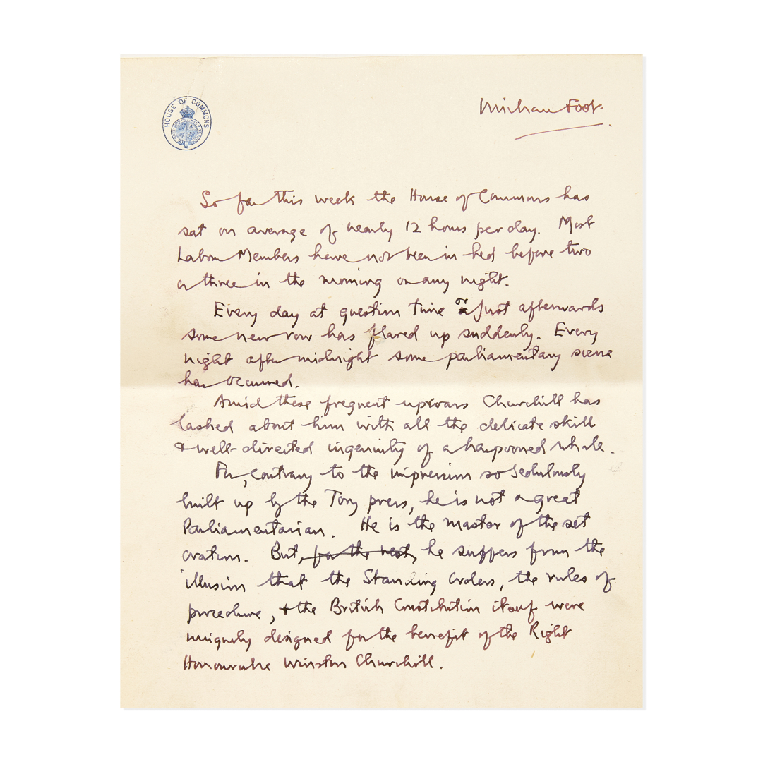 Foot, Michael. Esteso discorso politico autografo, su carta intestata “House of Commons”, dell’importante politico britannico, leader del Partito Laburista e oppositore di Margaret Thatcher. Foot ricorda l’intensa attività di quel periodo: “so far this week the House of Commons has sat an average of nearly 12 hours per day”; e conclude il suo discorso con una citazione del conservatore Randolph Churchill, padre di Winston, sfruttata abilmente per avanzare accuse di egoismo contro il governo in carica.