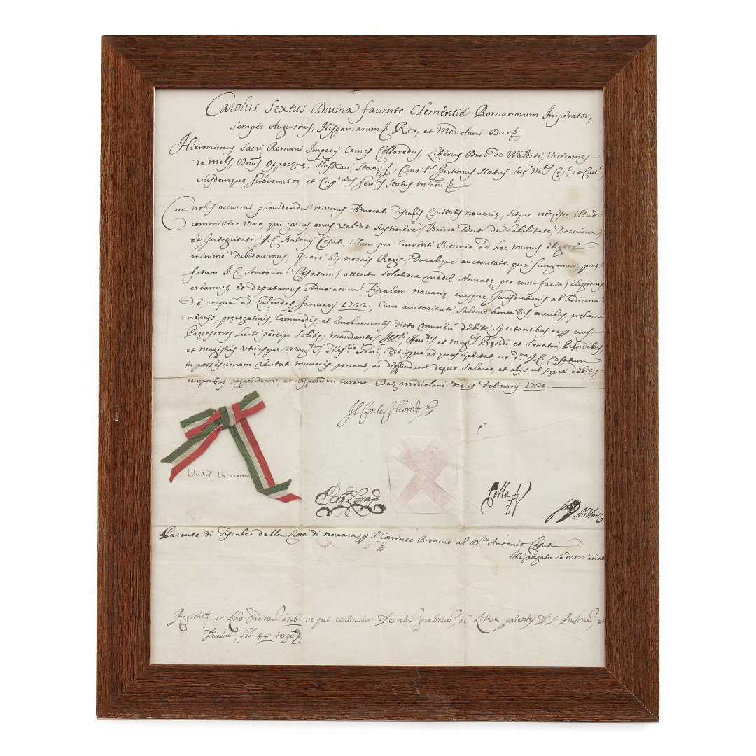 Girolamo di Colloredo-Waldsee. Elegante documento manoscritto in cornice (560 x 450 mm), recante firma autografa "il Conte Colloredo", redatto in latino e con sigillo in ceralacca. Con questo provvedimento emanato il giorno 11 febbraio 1720, il nobile e diplomatico austriaco, governatore di Milano al tempo dell'imperatore Carlo VI d'Asburgo, nominò Antonio Cesati come avvocato fiscale di Novara: "Cum nobis occurrat providendum munus advocati fiscalis civitatis Novariae, sitque necesse illud committere viro, qui ipsius onus valeat sustinere, idcirco edocti de habilitate, doctrina, et integritate Antonii Cesati, illum pro currenti biennio ad hoc munus eligere minime dubitavimus".
